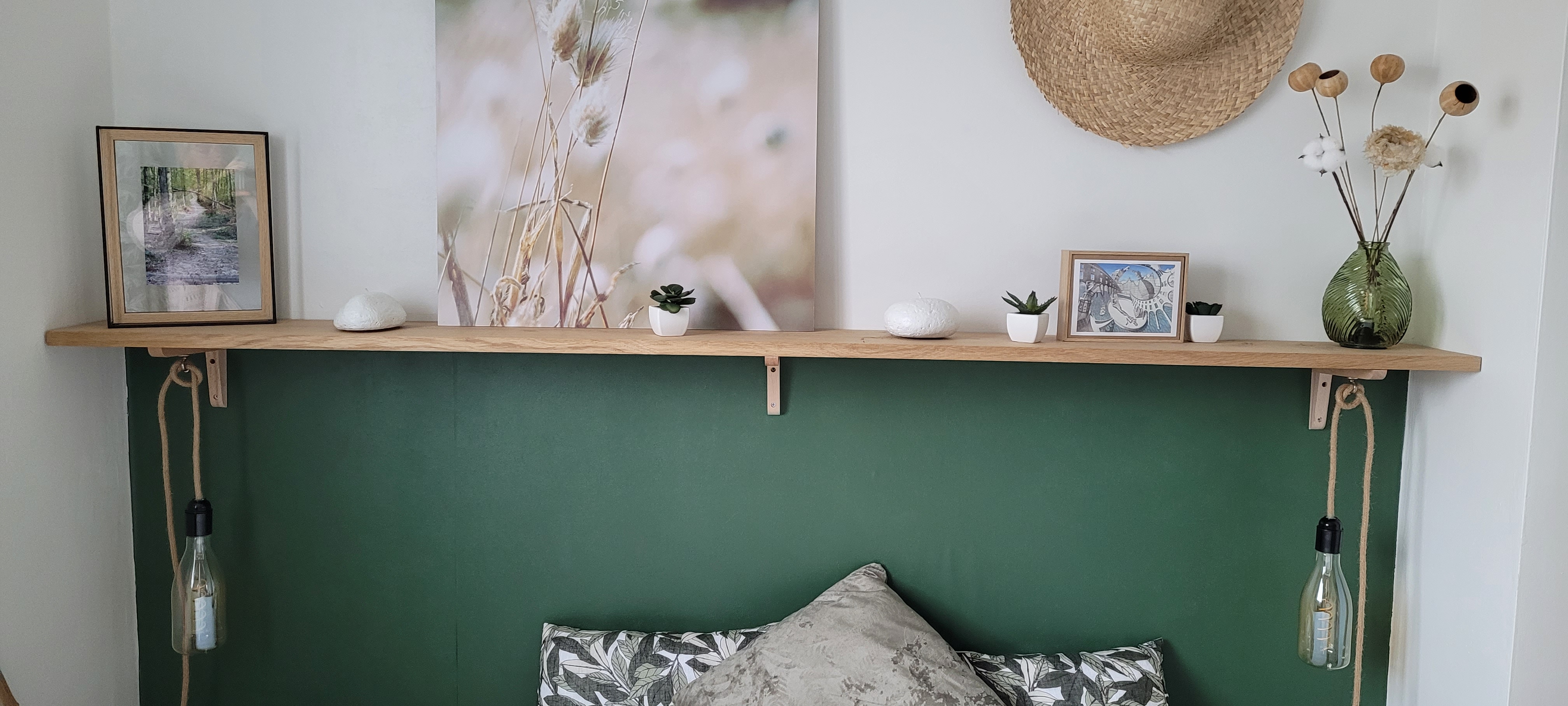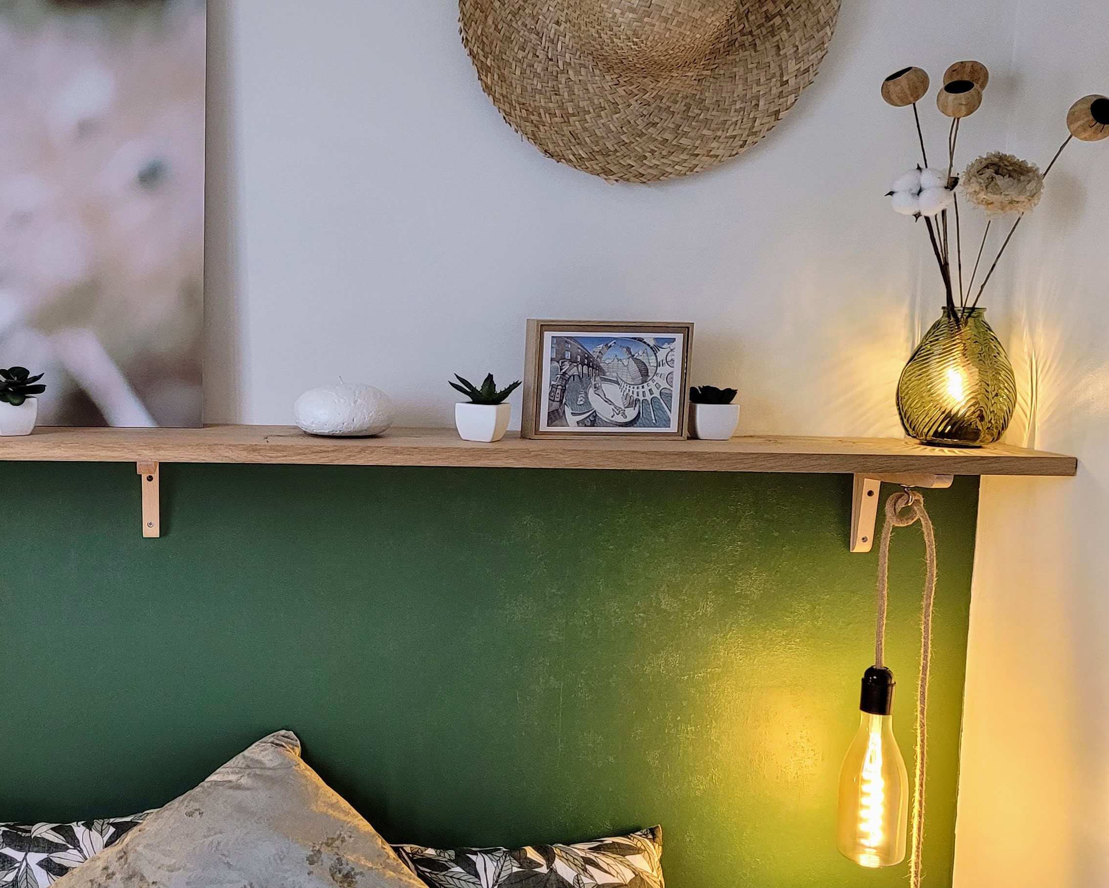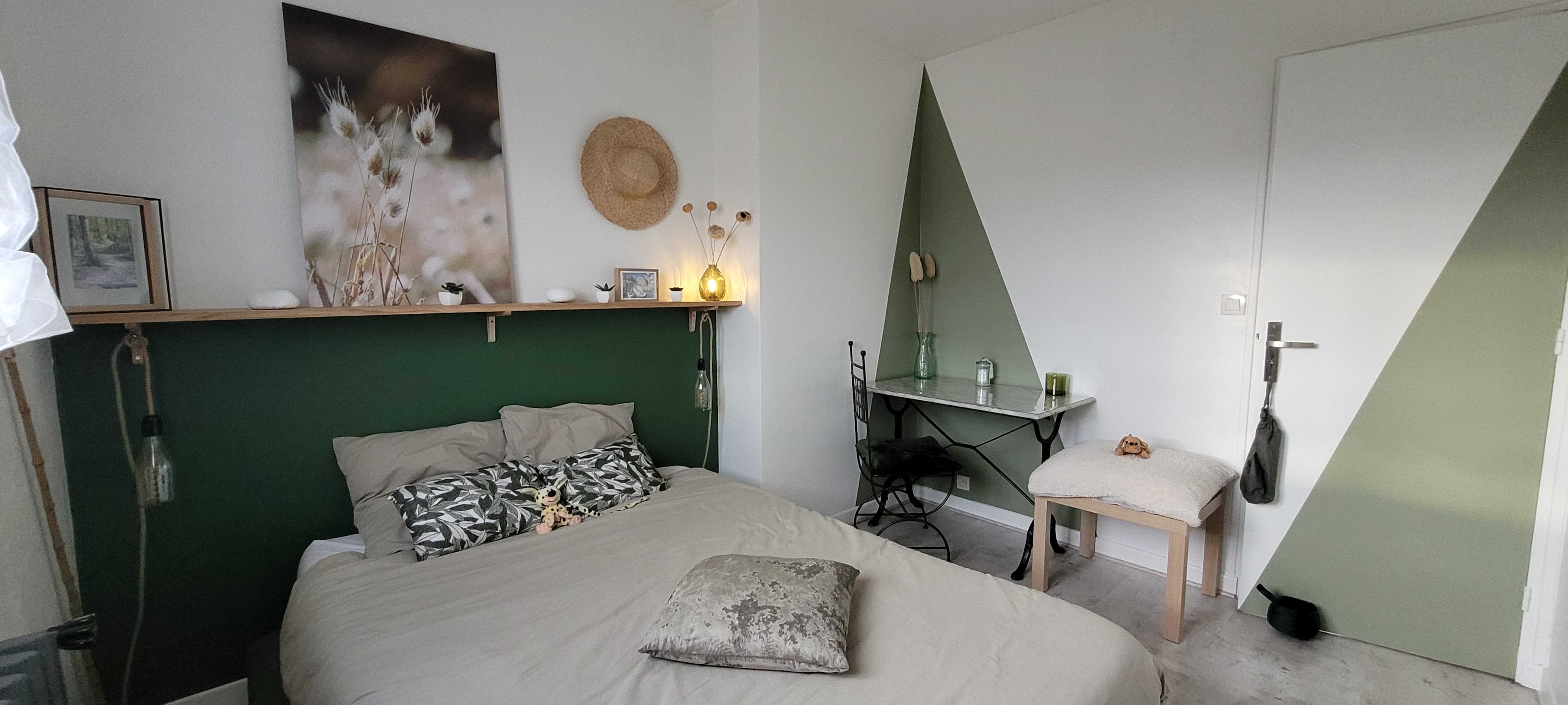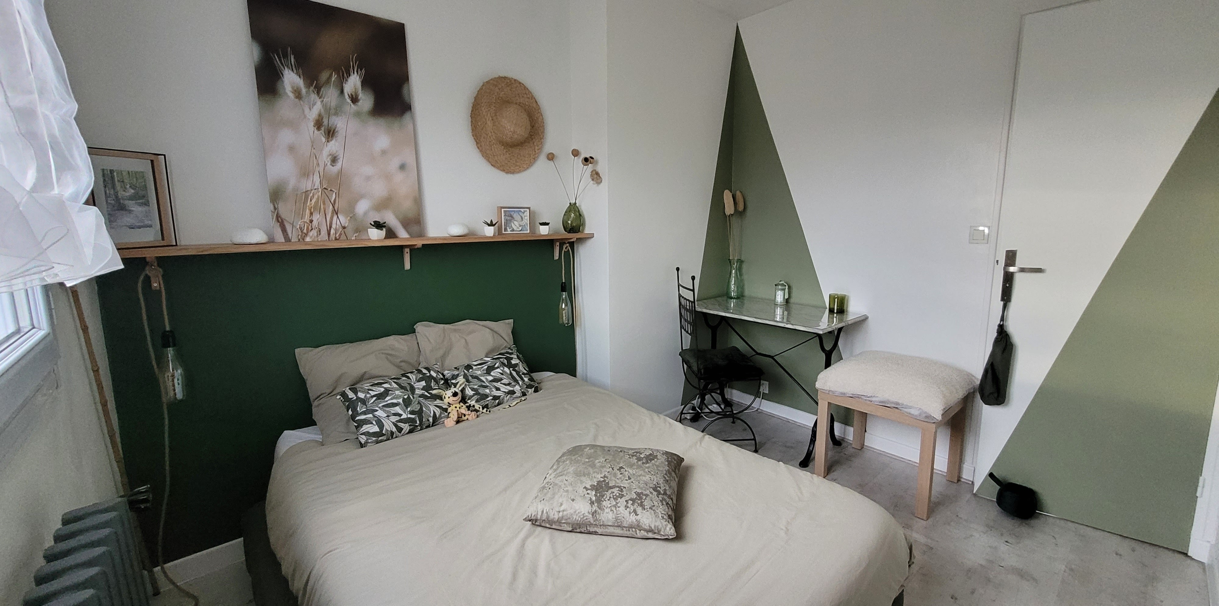 Une chambre de 10m2 refaite entièrement à neuf pour mois de 400€ avec une décoration dans les tendances actuelles de vert dégradé dans un style bohème chic.