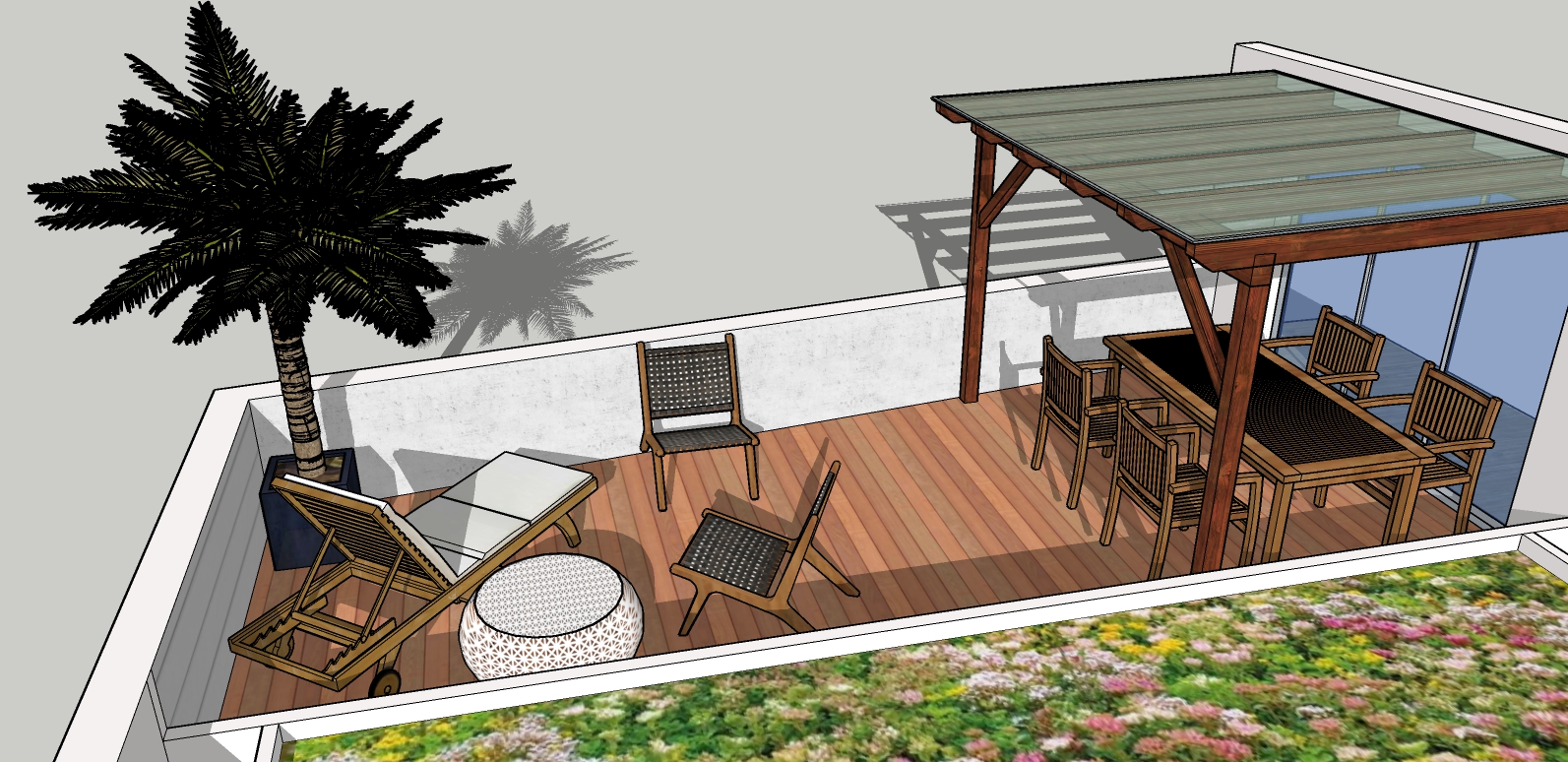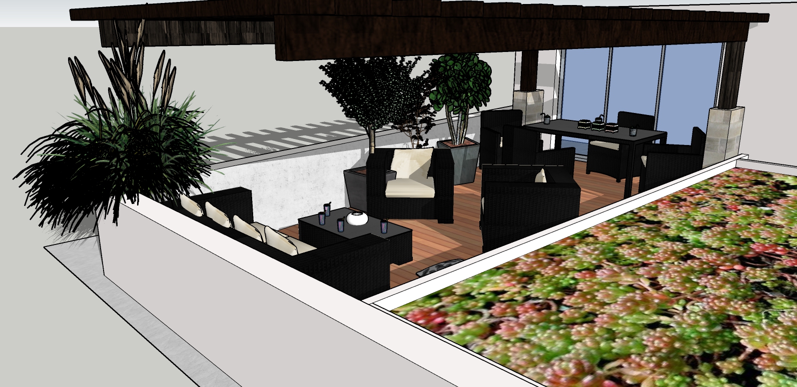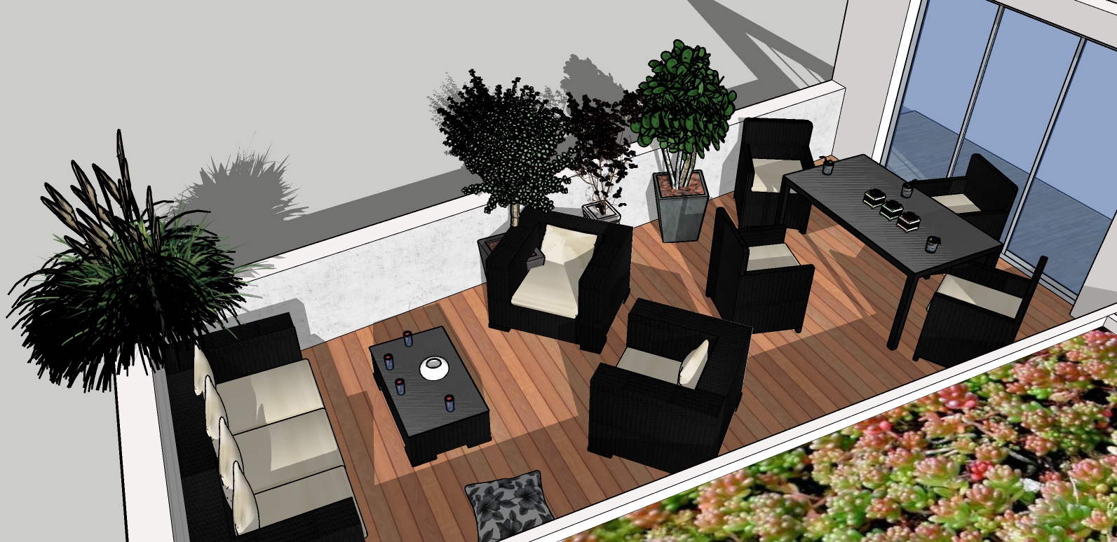 Une magnifique terrasse de 25m2 au dernier étage a l’état brut puisque l’immeuble vient de se finir. Une décoration proposée grâce au plan communiqué par mail et une liberté de proposer trois styles différents pour un aménagement pratique, esthétique et cocooning.